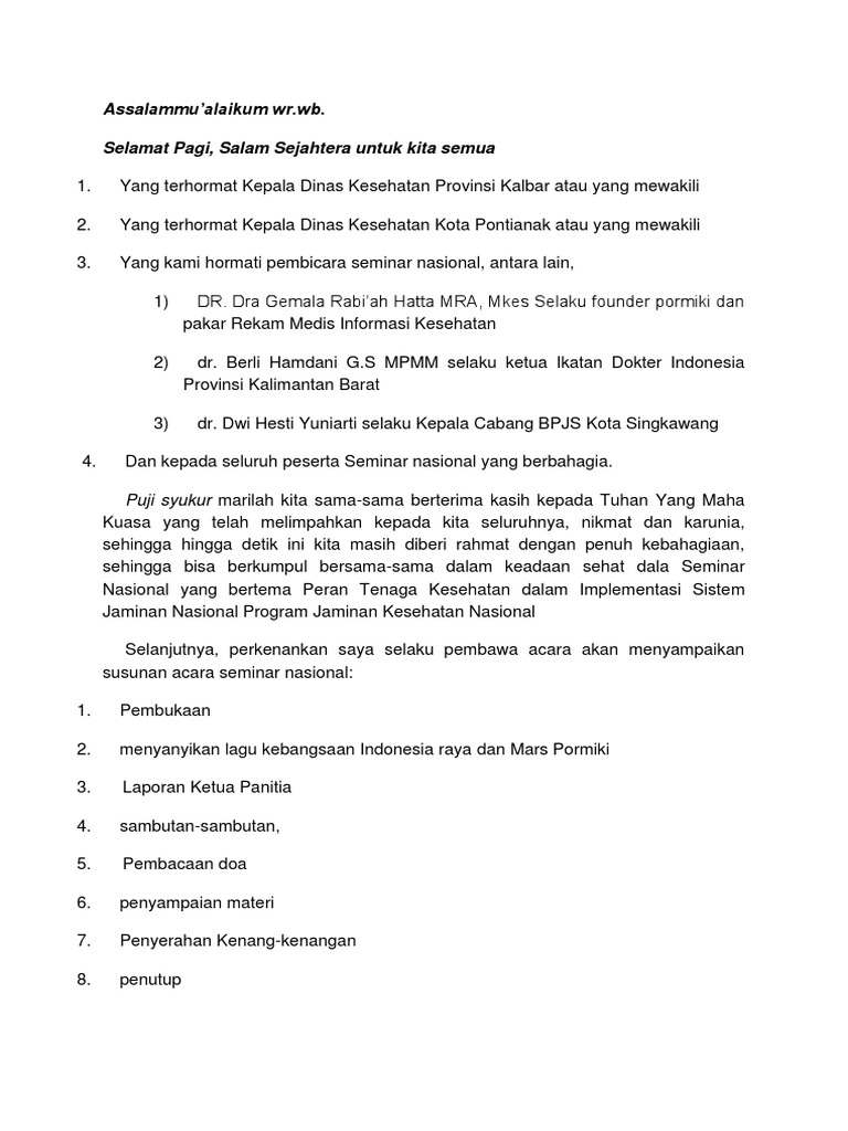 Hadirin yang saya hormati, saya sebagai pembawa acara hari ini akan membacakan susunan acaranya terlebih dahulu, mulai dari acara pembukaan sampai dengan doa bersama dan penutupan.