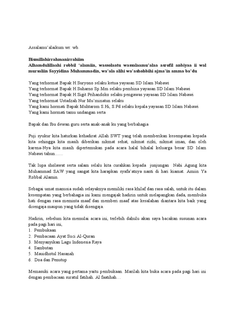 Halal bihalal yang menggunakan pembawa acara biasanya dilakukan jika dihadiri oleh banyak peserta. 20 Contoh Teks Pidato Bahasa Jawa Singkat Padat Jelas Krama. Teks Mc Halal Bi Halal Mushalla Nurul Huda 1434 H.