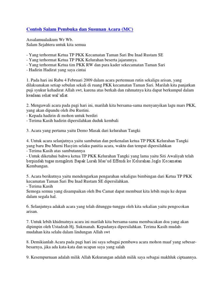 3 Contoh Teks Pembawa Acara Pkk Desa Muda Mudi Condrowangsan