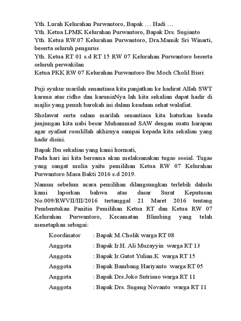 Doa penutup acara pkk. Contoh pidato kampanye ketua osis. Doc Panitia Pemilihan Ketua Rukun Tetangga Dimas Satriyo Wedana.