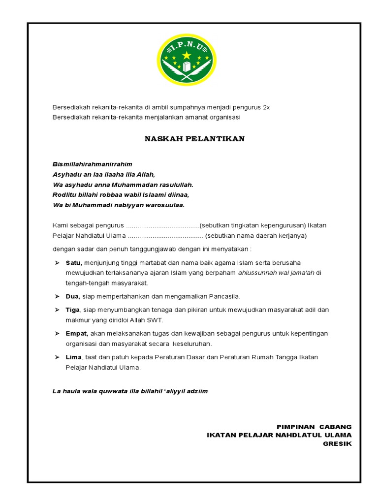 Kalau yang sudah biasa mungkin sudah paham dan tak perlu Contoh Naskah Pelantikan IPNU IPPNU ini. Acara yang ketujuh prosesi pelantikan pengurus ikatan pelajar Nahdhatul Ulama-ikatan pelajar putri Nahdhatul ulama komisariat Roudlotusysyubban. Kata kata pelantikan dengan memanjatkan puji syukur kehadiran tuhan yang maha esa atas rahmat dan taufiqnya pada hari ini rabu tanggal lima belas nopember dua ribu tujuh belas sebagai tindak lanjut dari keputusan bupati lombok timur nomor.