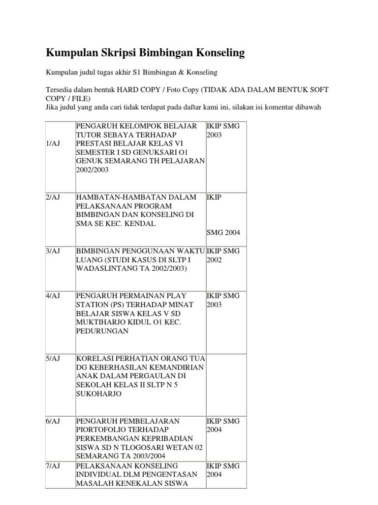 Contoh skripsi bimbingan konseling kode aj hardcopy. 11 rows JUDUL PROPOSALSKRIPSI Keterangan. Kumpulan Contoh Judul Skripsi Bimbingan Konseling Islam Jasa Skripsi Jasa Pembuatan Skripsi 04102019 15062021 Skripsi Yuk adalah jasa pembuatan skripsi Bimbingan Konseling Islam.