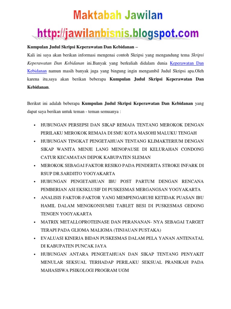 32 Referensi Judul Skripsi Kebidanan Terlengkap Memilih judul untuk Skripsi atau tugas akhir memang bukan perkara mudah. Academiaedu is a platform for academics to share research papers. Judul skripsi d-iv bidan pendidik judul skripsi d-iv bidan pendidik terbaru 1.