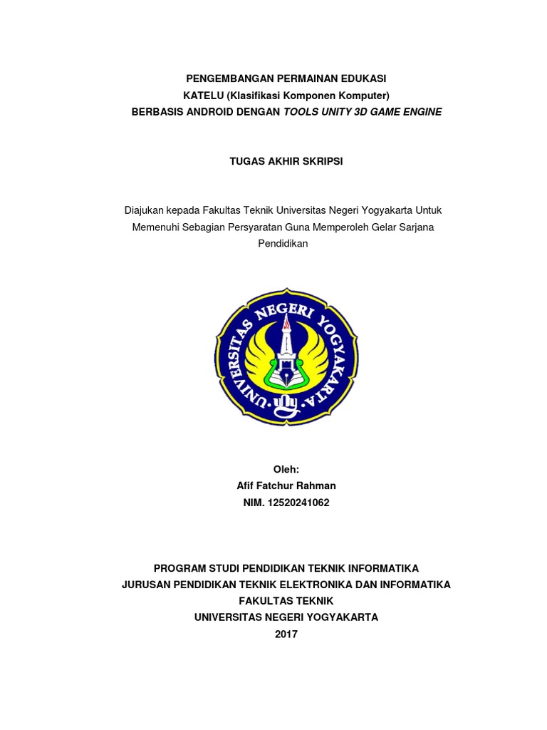 Contoh proposal skripsi pengembangan game edukasi bab i. Skripsi merupakan karya tulis ilmiah yang berupa paparan tulisan dari hasil penelitian yang membahas suatu permasalahan dalam bidang ilmu tertentu serta menggunakan kaidah yang berlaku. Perancangan media pembelajaran berbasis game edukasi untuk meningkatkan pemahaman materi gerak lurus ipa smp.