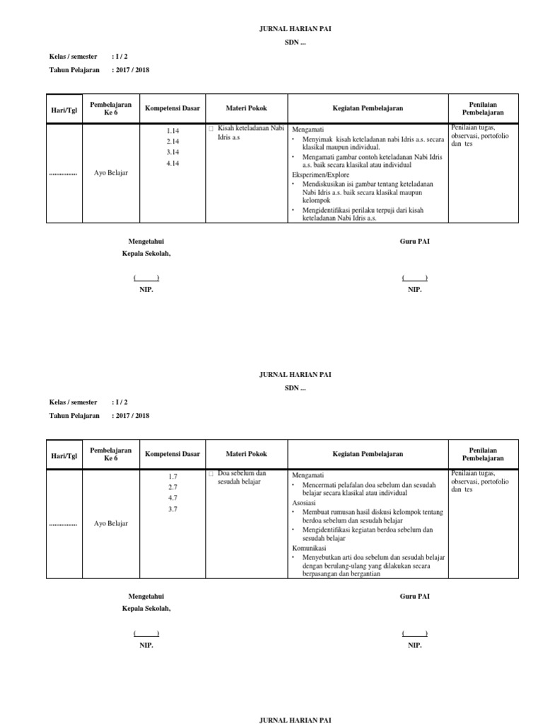 11 Jun 2021 Label. Contoh jurnal harian guru pai kelas 5 terbaru edisi revisi 2020 semester 1 By acces Post a Comment AKSESYASIN – – – Selamat datang sahabat pembaca aksesyasin kali ini admin akan membagikan Jurnal Harian PAI Kelas 5 Edisi terbaru RevisiDisini admin akan membagikan jurnal harian atau agenda harian mapel PAI SD dibawah ini merupakan contohnya. Skmt dibawah ini adalah contoh skmt pesan ini isinya menerangkan tugas serta jumlah jam mengajar seseorang guru.