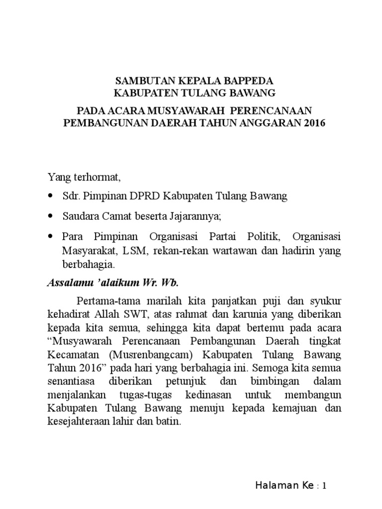 Contoh Pidato Sambutan Musrenbang Kabupaten Kata Sambutan Pembukaan Musrenbang