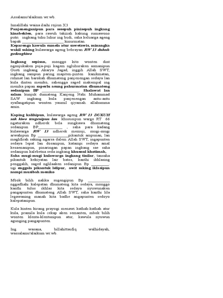 Innalillahi waina ilaihi rojiun. Pidato bahasa jawa upacara pemakaman jenazah. Hadirin sekalian yang kami hormati sebagai mana telah kita ketahui bersama dihadapan kita sekarang ini telah wafat sejak tadi pagi tepatnya pukul lima sesudah subuh.