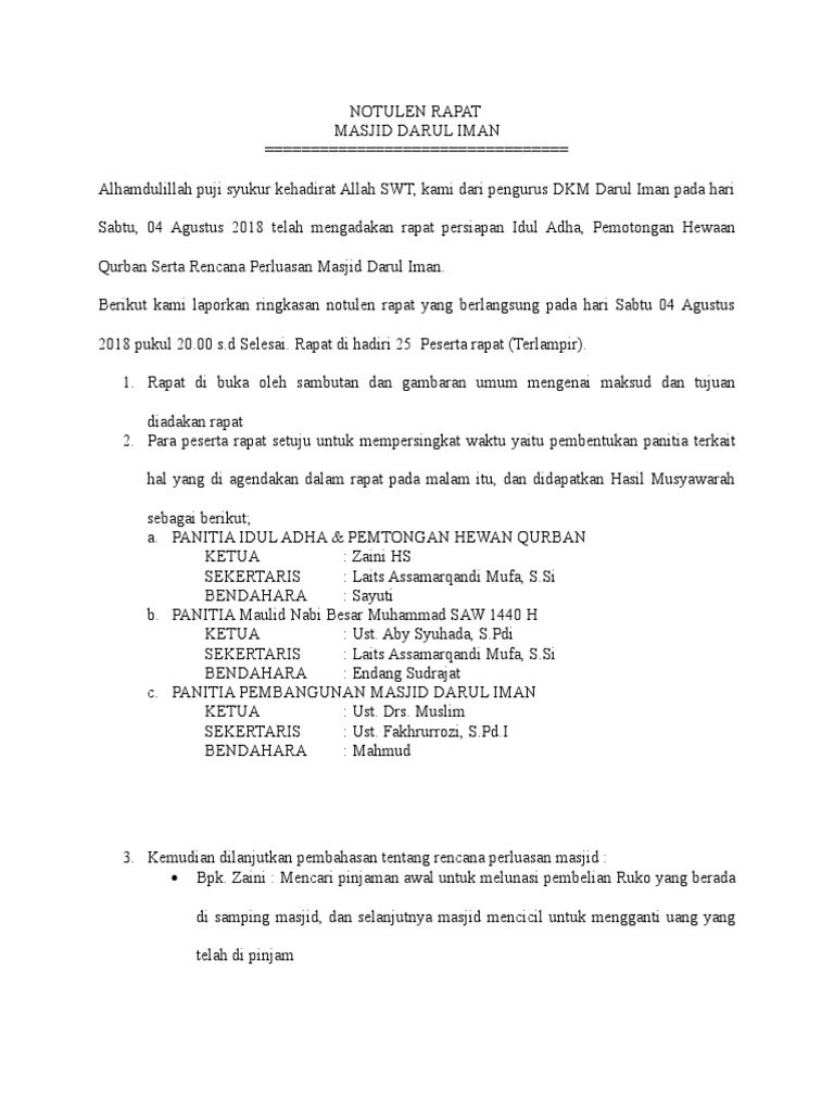 Simpan Simpan Notulen Rapat Panitia Qurban Untuk Nanti. Contoh Surat Undangan Menghadiri Rapat Pembentukan Panitia Natal. Dan setelah hewannya dipotong maka panitia mengambilnya sesuai dengan permintaan dan ketika orang yang berkurban datang maka panitia langsung memberikannya.
