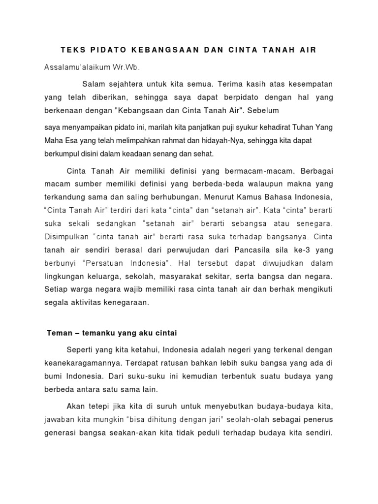 Contoh Teks Pidato Pidato. Pidato Cinta Tanah Air Mencintai tanah air adalah sesuatu yang harus ditanamkan sejak dini terlebih lagi kepada anak-anak usia muda. Web Contoh Pidato Bahasa Inggris Tentang Cinta Tanah Air dan Artinya.