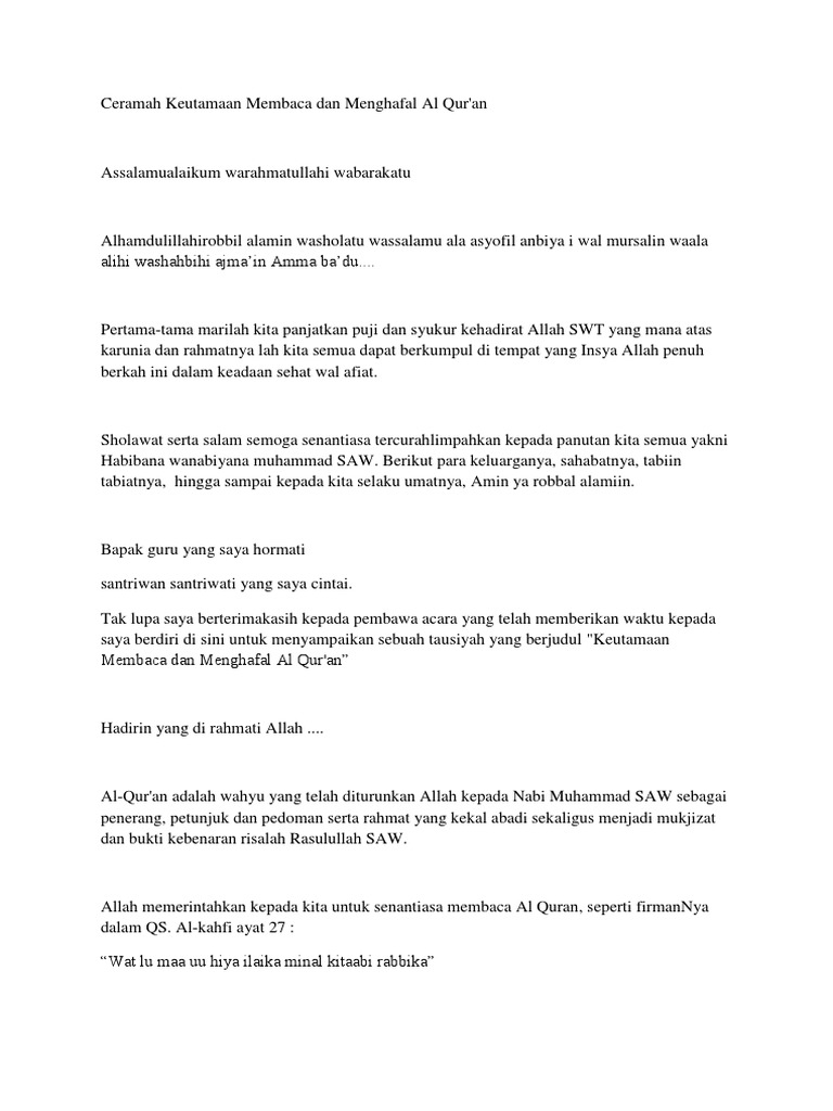 Contoh pidato keutamaan membaca alquran. Contoh teks pidato singkat yang akan mimin bahas seperti pidato tentang pendidikan bahasa indonesia agama islam tentang al quran pidato pembangkit semangat pidato sambutan acara atau event dan lain sebagainya. Al-Quran adalah kalamullah firman Allah SWT yang diturunkan kepada. Harapan saya semoga dengan membaca wawasan kita akan lebih luas dan minat membaca kita semakin besar.