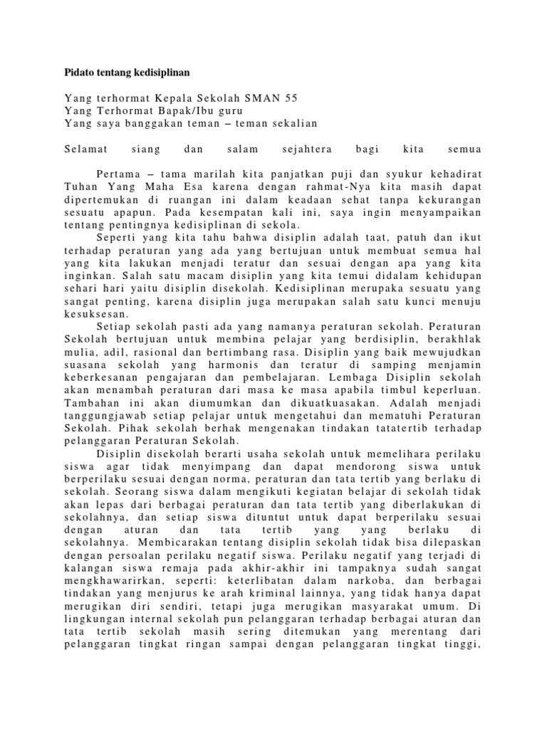 Disiplin dilakukan di rumah di sekolah di jalan raya dan di tempat lain. Pidato disiplin kunci kesuksesan Kali dalam hal Berpidato berikut adalah tentang contoh naskah berpidato tentang Disiplin Kunci kesuksesan mungkin bagi anda yang sedang mencari untuk memenuhi tugas sekolah silahkan Contoh teks naskah pidato ini bisa dicopas menurut yang saya dapatkan dari wikipedia berikut adalah pengertian dari PIDATO itu sendiri belajar terus supaya. Alhamdulillahirrobbilalamin membantu siswa memahami dan.