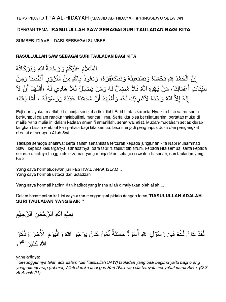Contoh pidato tentang nabi muhammad saw sebagai uswatun hasanah. Nabi yang telah memberikan contoh akhlak yang mulia bagi seluruh umat manusia. Tafsir QS Al-Ahzab21 AYAT Al-Quran yang menegaskan keteladanan Rasulullah Saw QS Al-Ahzab21 dipastikan banyak disampaikan oleh para penceramah khususnya pada bulan Rabiul Awal Mulud yang kita kenal sebagai bulan kelahiran Nabi Muhammad Saw Maulid Nabi Saw. Firman Allah SWT.