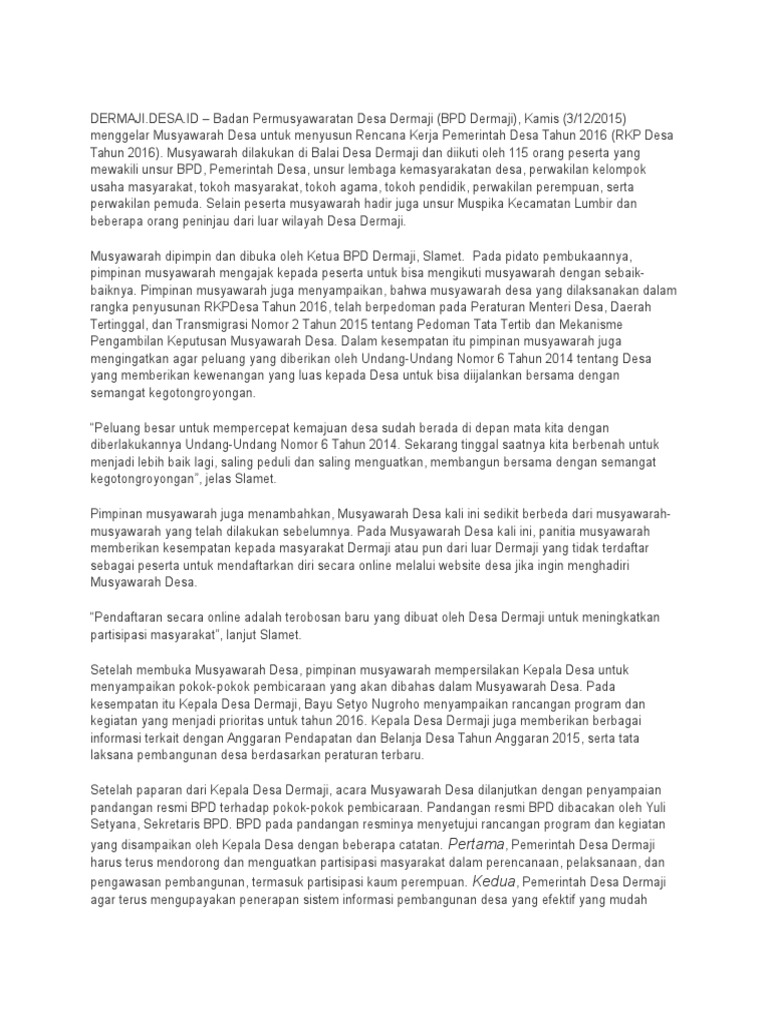 Berikut Contoh Susunan Acara Musyawarah Desa Khusus Musdessus Penetapan Data SDGs Desa. Bapak Camat Tenggarong Seberang beserta Jajarannya. Dari tiga tugas ini sudah jelas BPD adalah lembaga yang memiliki kekuatan dalam dalam menyepakati peraturan desa yang bakal menjadi pedoman pelaksanaan pembangunan desa.