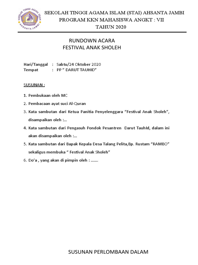 Namun kali ini bukan soal pertandingannya yang akan kita bahas melainkan tentang kata sambutan yang biasanya disampaikan sebagai pembukaan lomba. PROPOSAL FESTIFAL ANAK SHOLEH. Sambutan Ketua Panitia Kata sambutan merupakan salah satu agenda acara yang hampir selalu ada di setiap acara baik di lembaga formal maupun lembaga non formal pada acara-acara yang bersifat formal ataupun nonformal.