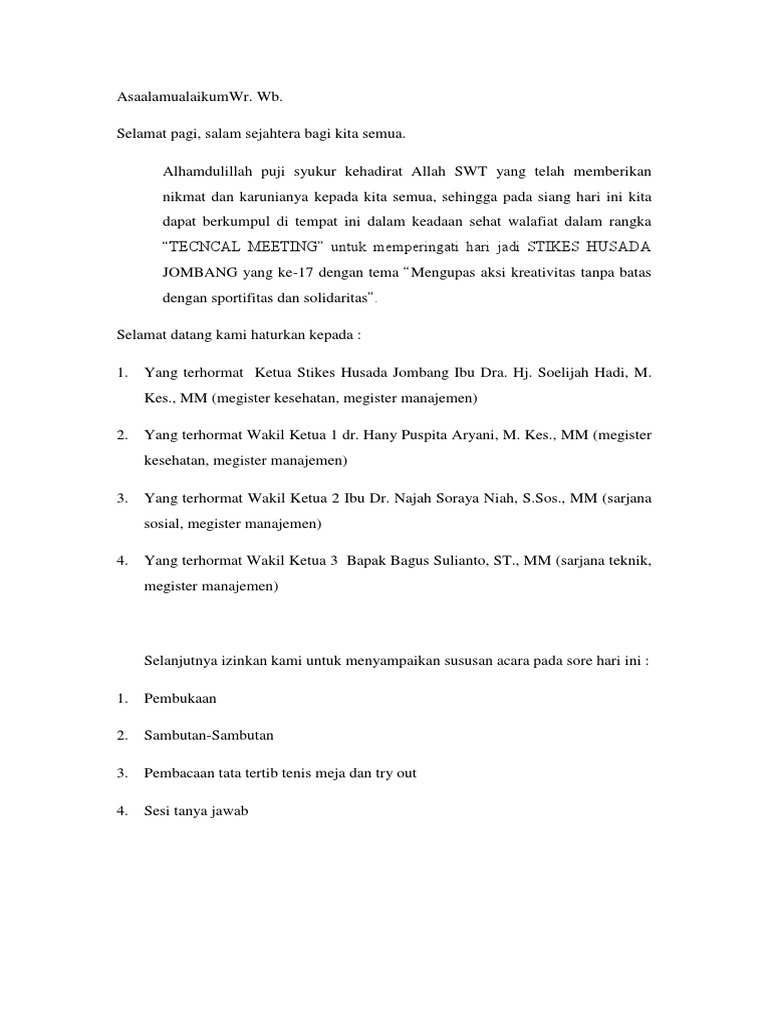 Contoh sambutan ketua panitia technical meeting. Pembina Himpunan Mahasiswa Pendidikan Sejarah yang dalam sambutannya berpesan agar technical meeting ini dapat digunakan semaksimal mungkin untuk memberikan informasi secara jelas terkait pelaksanaan. Seluruh panitia pelaksana kegiatan class meeting Yth. Acara Pembukaan acara Kalam ilahi Menyanyikan lagu.