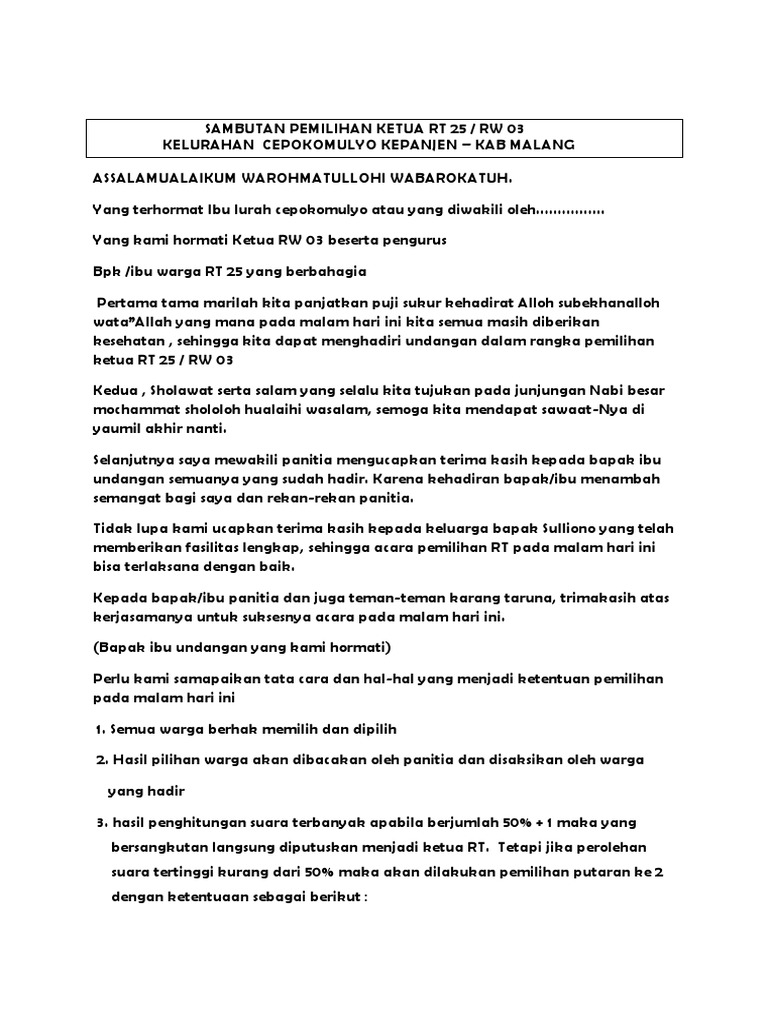 Hasil pemilihan ketua rt dituangkan dalam berita acara pemilihan dan disampaikan oleh panitia pemilihan kepada lurah. Adapun pokok-pokok sambutan ketua RT dalam acara halal bihalal misalnya adalah sebagai berikut. File berformat Microsoft Word Documents DOCRTF silahkan download secara gratis dan kembangkan kembali agar lebih sempurna.