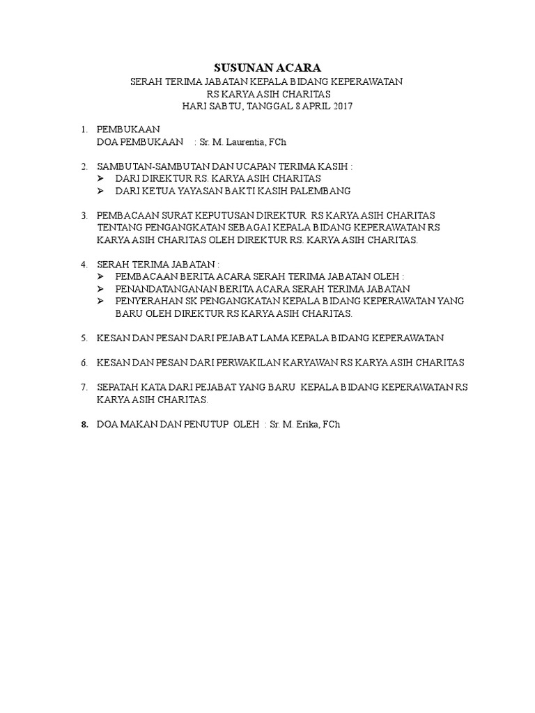 Maka tak heran jika acara semacam ini sering pula disebut acara pisah sambut. Berita Acara Serah Terima Jabatan Kepsek. Yang ke sembilan penutupanDemikianlah susunan acara pada malam serah terima jabatan RT iniMenginjak acara yang ke dua yaitu sambutan dari Ketua Panitia Pemilihan RT.