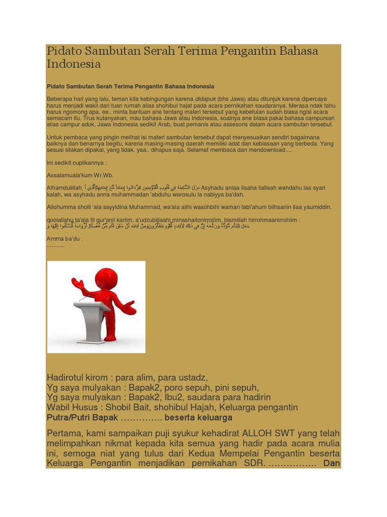 Dan ingat yang terpenting adalah kata sambutan tidak perlu terlalu panjang karena para tamu undangan akan merasa bosan. Contoh naskah pidato atau contoh naskah sambutan pengantin pria ya mungkin anda ingin atau sedang mendapat suatu undangan untuk menyampaikan sambutanpidato dalam acara pernikahan dan tepatnya perwakilan bagi pengantin pria laki-laki langsung saja yah gakusah bayak bincag karna saya memang tidak begitu pandai dalam berbincang bincang. Numana manteuna parantos maparin Nimat ka urang sadaya sahingga urang sadaya tiasa pateupung.