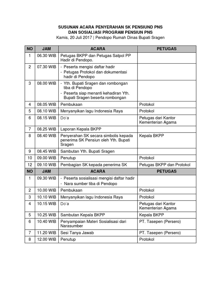 Contoh susunan acara sosialisasi bpjs. Web Teks susunan acara sosialisasi biasanya dibutuhkan oleh moderator atau pembawa acara dalam memimpin dan membawakan sebuah agenda acara sosialisasi. By Posted on January 17 2023. Teks MC Acara Pertemuan Wali.