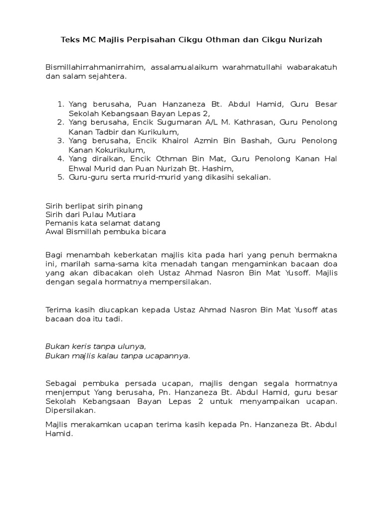 Teks MC Majlis Perpisahan Guru