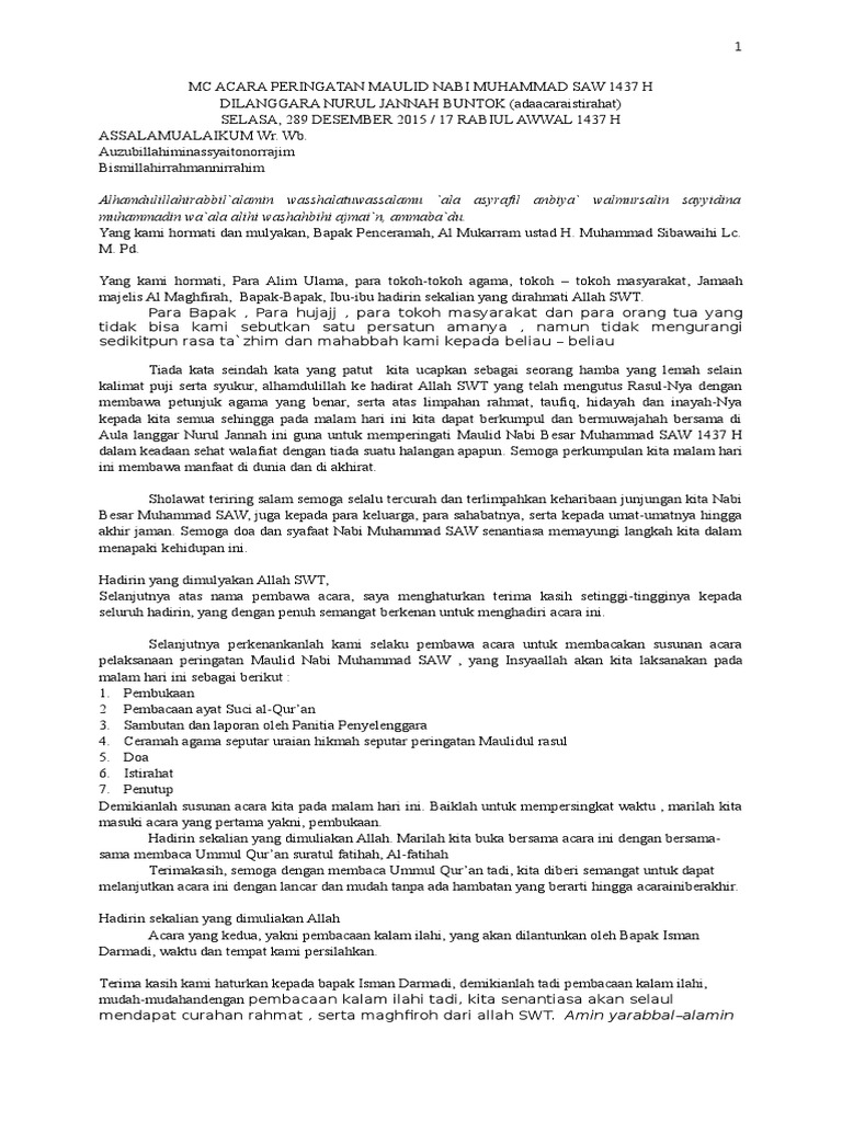 Mc Acara Peringatan Maulid Nabi Muhammad Saw 1437 H Langgar Nurul Jannah 16 Mei 2015 Pdf