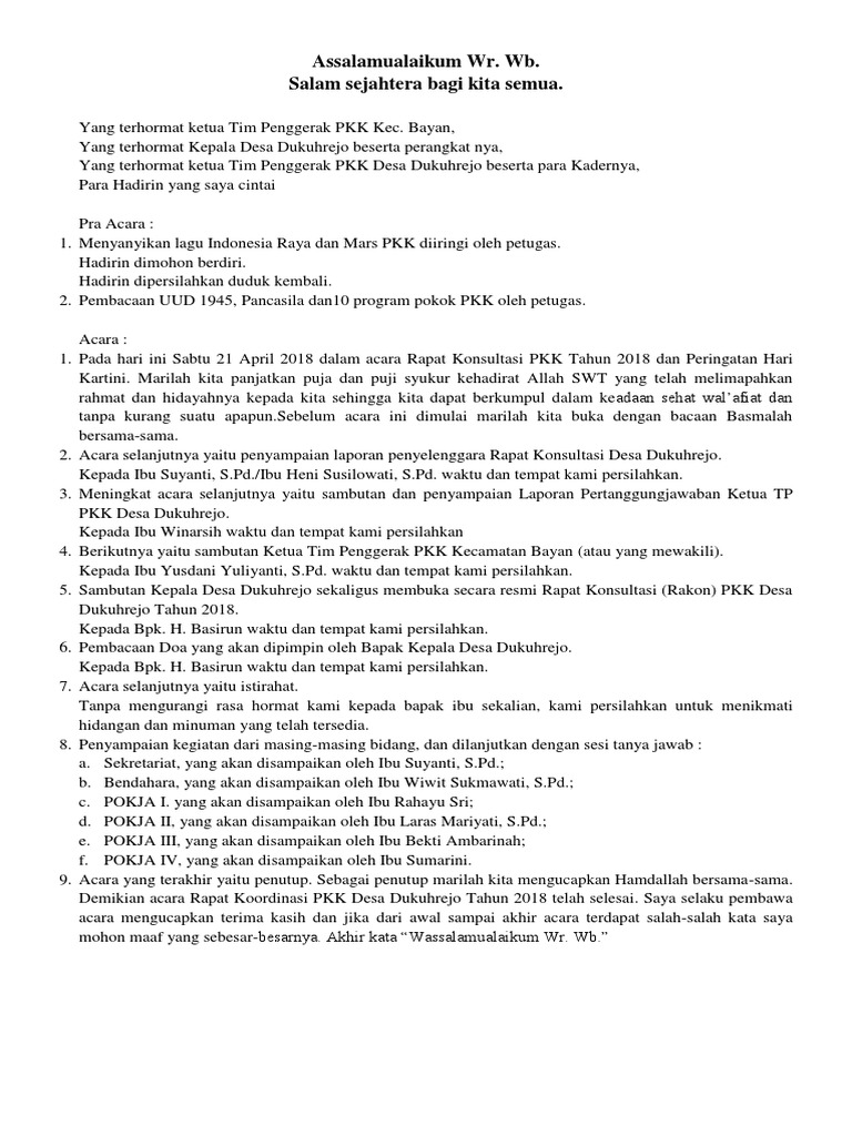 Contoh Salam Pembuka Dan Susunan Acara Do A Pkk Contoh Naskah Sambutan Ketua Pertemuan Rutin Pkk Muda Mudi. Teks Pembawa Acara Pkk Desa Terbaik – Hallo sahabat Kumpulan Contoh Teks MCSelamat datang diblog kamiBlog kumpulan contoh contoh teks pembawa acara atau MC.