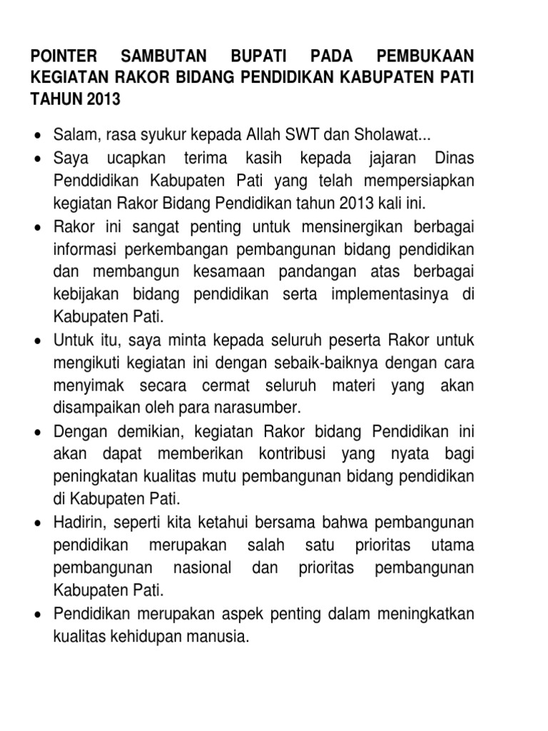 Pointer Sambutan Bupati Pada Pembukaan Kegiatan Rakor Bidang Pendidikan