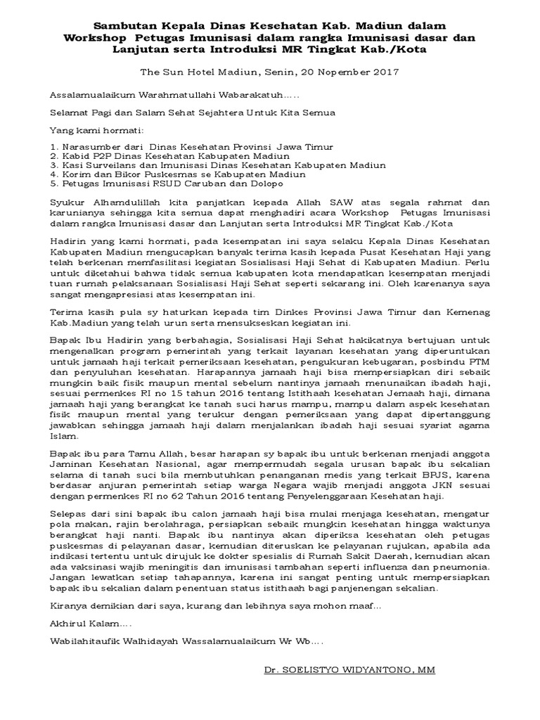 Sambutan Selamat Datang Kepala Dinas Kesehatan Dalam Rangka Pembukaan