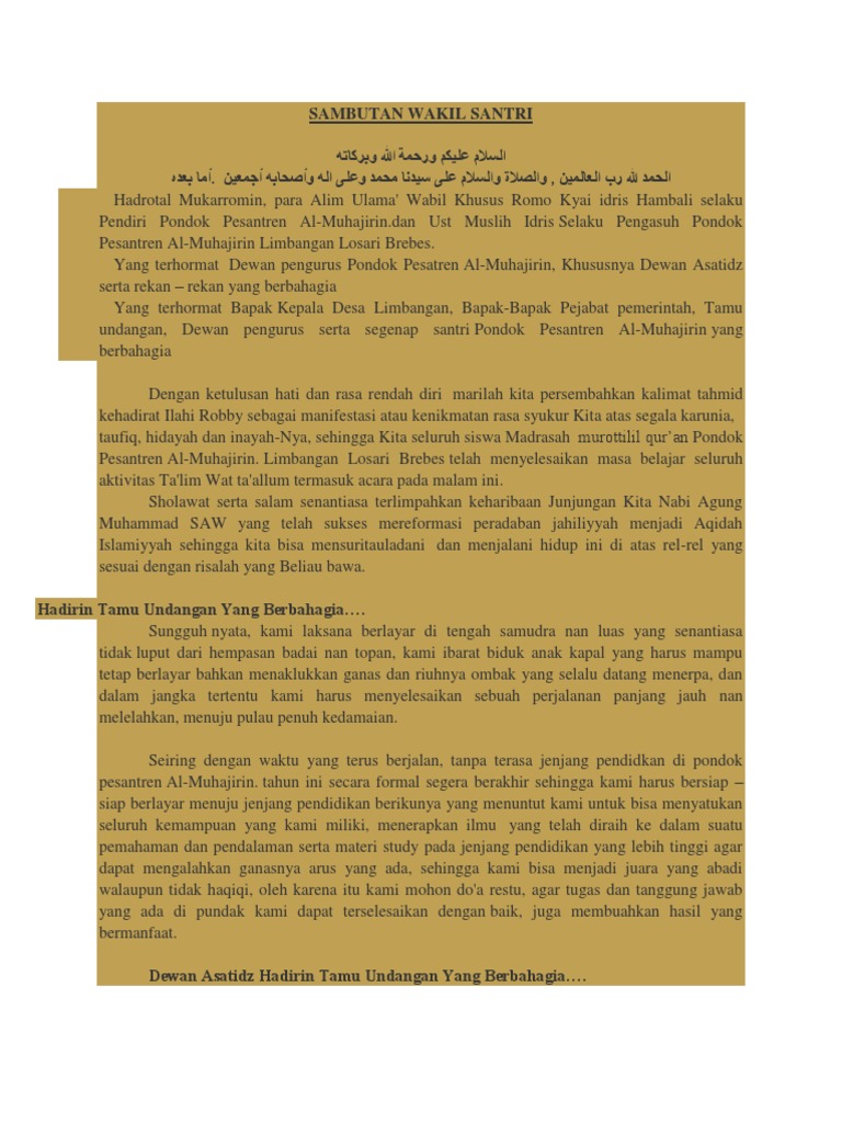 Contoh kta sambutan rpat wali santri informasi mengenai contoh kta sambutan rpat wali santri dapat anda pilih dari daftar bacaan yang ada di bawah ini. Romo Kyai idris Hambali Wa ahli baitih atas segala doa dan bimbingannya Pengasuh Pondok Pesantren Al-Muhajirin Limbangan Dewan asatidz Pondok Pesantren Al-Muhajirin atas keikhlasannya mengajar dan menuntun kami sehimgga kami sedikit mengerti murodnya asal sumelehe mengerti tentang rujuk-rujuk yang bertaburan bagaikan bintang-bintang di malam purnama serta. Teks Sambutan Ketua Panitia Wisuda Terbaru Kumpulan Referensi Teks Pidato.