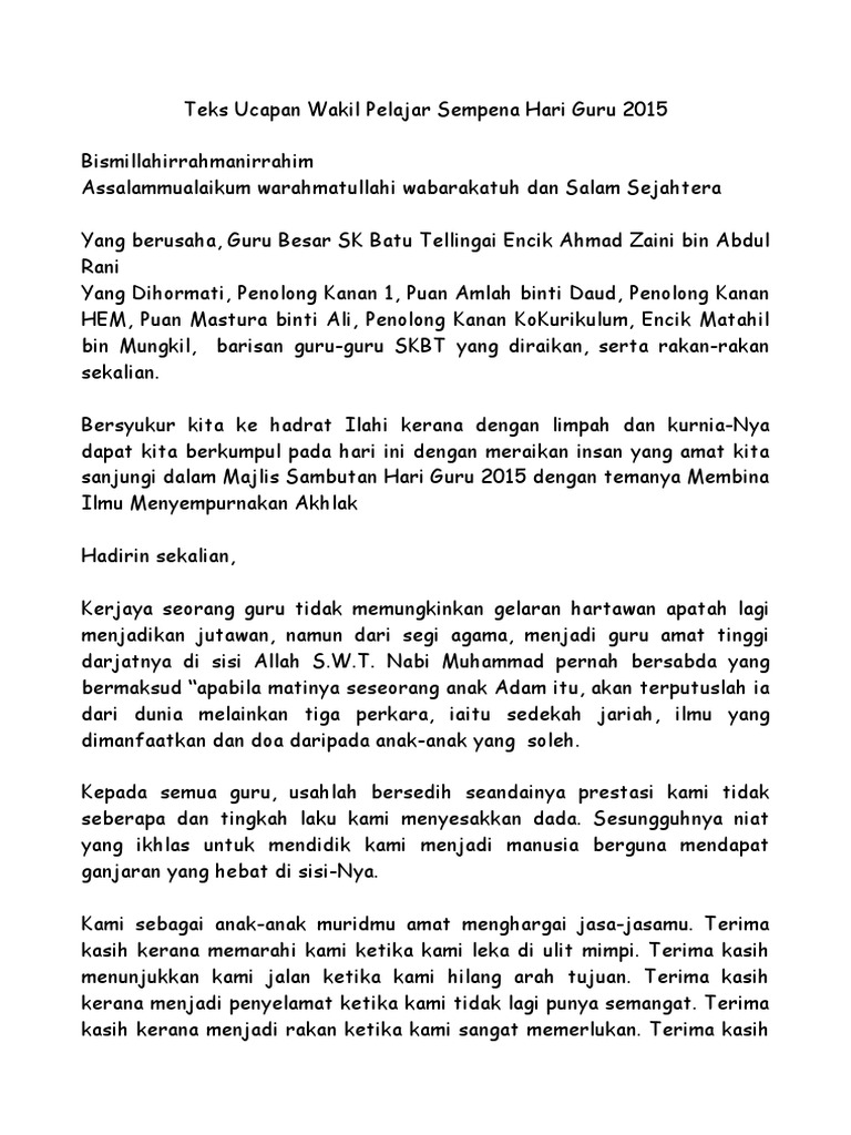 Web Baca juga. Puji syukur kehadirat Allah SWT karena pada pagi yang cerah ini kita dapat berkumpul dalam upacara peringatan Hari Guru. Selamat pagi dan salam sejahtera untuk kita semua.