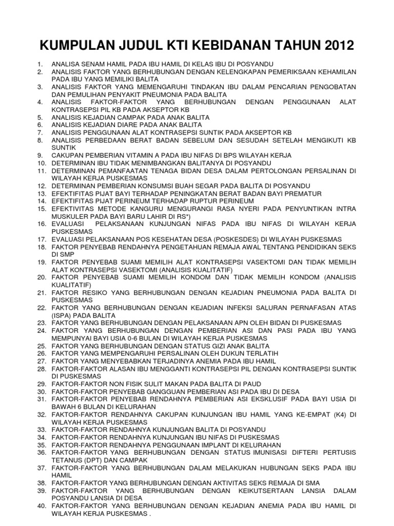 Kumpulan Judul Kti Kebidanan Terlengkap Tahun 2012 Artikel SkripsiYuk Jasa Skripsi Kumpulan Contoh Judul Skripsi Tips Skripsi Jasa Pembuatan Skripsi 19032021 23062021. Pendaftaran pusat pelatihan USG untuk bidan dan dokter umumcontoh judul kti kebidanan tentang kesproartikel tentang kebidanana. Kumpulan Judul KTI Kebidanan Terbaru 2017 Di bawah ini adalah Beberapa Contoh Judul KTI terbaru kebidanan yang bisa di jadikan acuan.