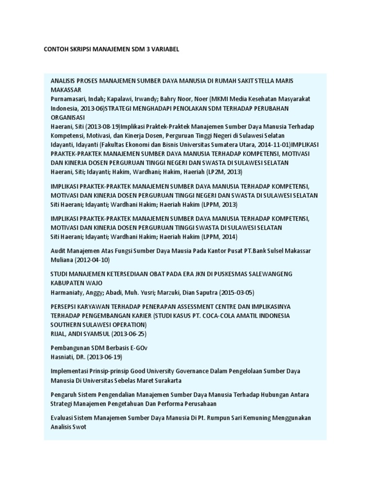 Anda berarti sangat perlu yang namanya referensi dalam. Web Judul skripsi sdm 4 variabel. Web Selain skripsi manajemen sdm 3 variabel yang sudah saya berikan diatas saya juga memberikan contoh judul skripsi manajemen sdm yang menarik untuk kalian.