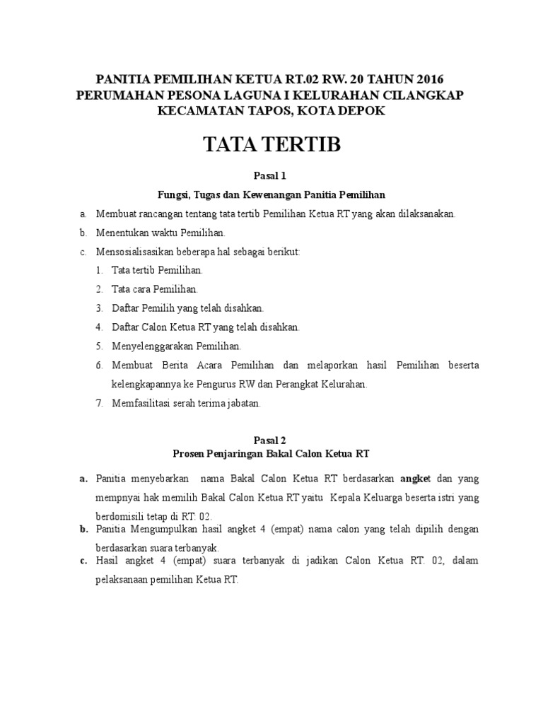 Tata tertib dibuat oleh panitia pemilihan rt rw dan ditanda tangani serta diketahuidisetujui ketua rw lembaga. Nah bagi sahabat yang sedang mencari contoh pidato sambutan ketua RT bisa melihat contoh pada postingan ini adapun kekuranagnnya bisa sobat tambah kata-kata sendiri. Doc Keprotokoleran Dan Pelantikan Karang Taruna Secara Umum Mujianto Ute Academia Edu.
