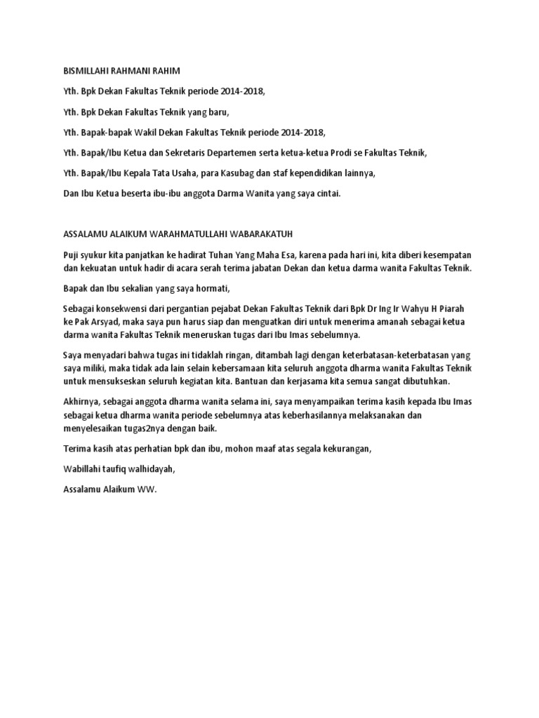 Kata Sambutan Kepala Sekolah Baru Pelantikan Kepala Sekolah Kata Sambutan Kepala Sekolah Lama Pelantikan Kepala Sekolah 2. Contoh Pidato Sambutan Ketua Dharma Wanita Persatuan Dwp Pada Acara Serah Terima Ketua Dharma Wanita Persatuan. Sambutan Ketua Panitia Darma Wanita Pdf Document Teks Pembawa Acara Sambutan Ketua Panitia Halal Bihalal Sambutan Ketua Umum Dharma Wanita Persatuan Pada Hari Ulang Tahun Ke Do A Pkk.