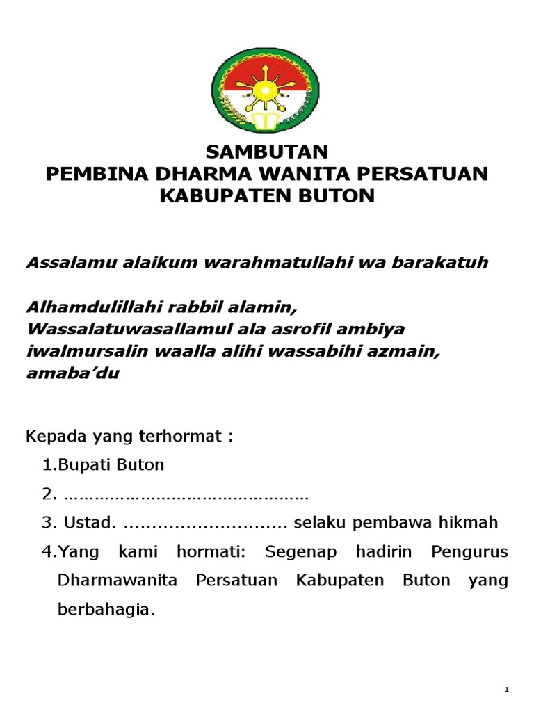 Sambutan Ketua Panitia Darma Wanita Pdf Document Teks Pembawa Acara. Apabila anda menjadi seseorang yang ditunjuk untuk menyampaikan kata sambutan tersebut berikut kami akan memberikan sebuah contoh kata sambutan acara arisan Dharma Wanita. Dinas Pendidikan kab dengan mengambil tema.