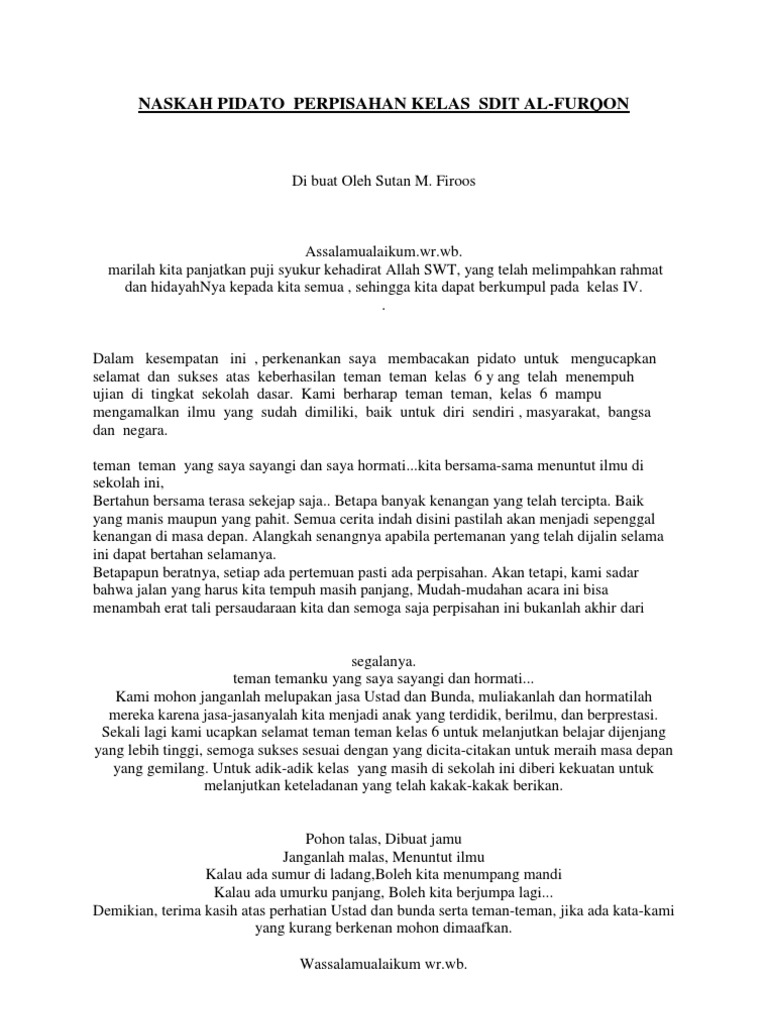 Naskah Pidato Perpisahan Siswa Kelas Vi Sdit Al Pdf