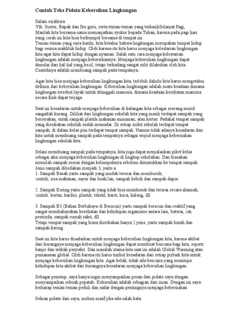 Web Pidato Tentang Kebersihan Pidato tentang kebersihan adalah pidato yang sebagian isinya menyampaikan tentang kebersihan. Contoh Pidato Persuasif Tentang Lingkungan Versi Singkat. Sebelum kita masuk ke pembahasan kamu harus tahu struktur dari teks pidato.