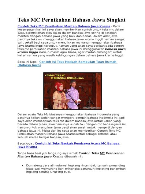 Contoh isi teks naskah pembawa acara mc bahasa jawa krama tanpa basa basi yuk langsung saja simak contoh teks mc pernikahan manten bahasa jawa. Berikut adalah rincian serta urutan ritual. Web berikut informasi sepenuhnya tentang contoh teks pranatacara bahasa jawa singkat.