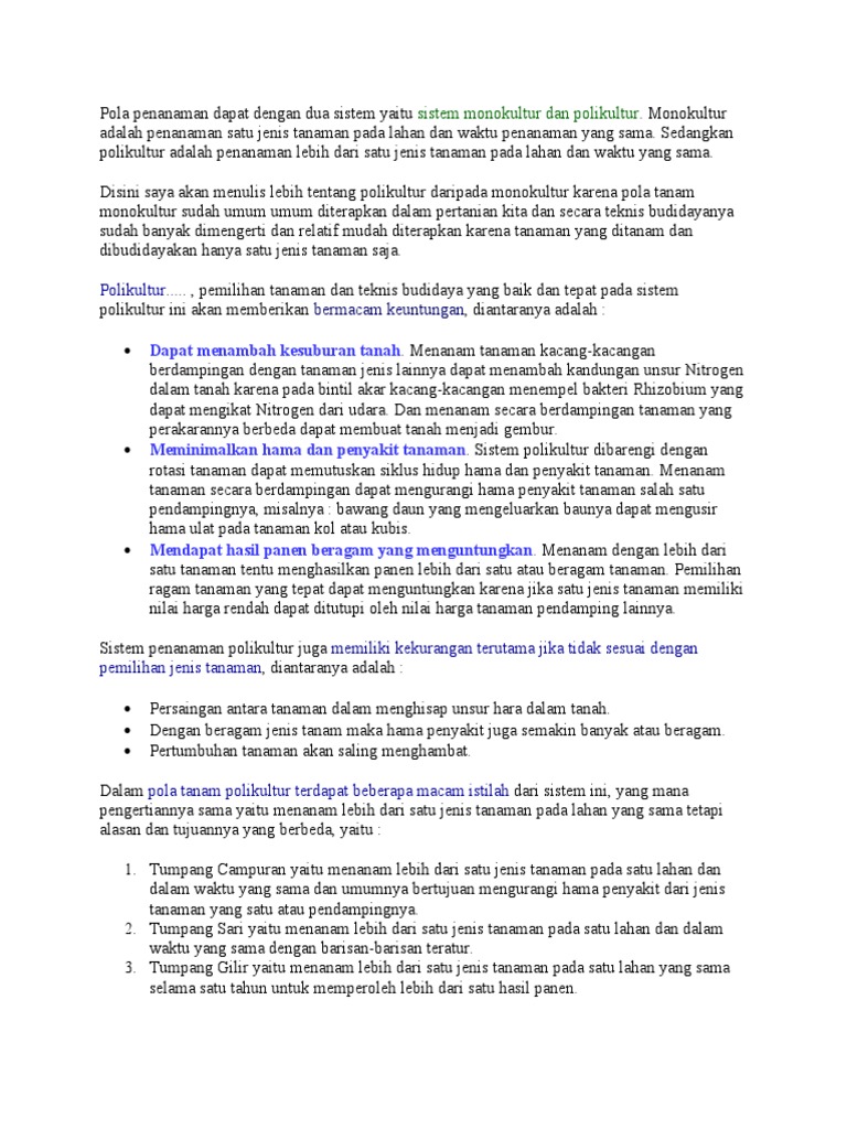 Polikultur Polikultur adalah menanam lebih dari satu jenis tanaman pada lahan dan waktu. Kekurangan sistem polikultur adalah. Macam Jenis Pola Tanam.