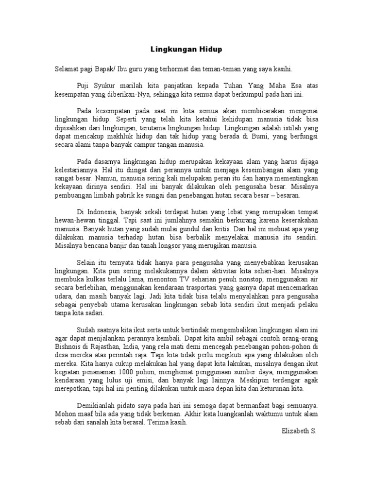 Web Beragam cara dapat dilakukan yang memang tak hanya sekedar teori namun juga diperlukan praktik langsung di lapangan. Contoh Pidato Tentang Lingkungan Hidup di Sekolah. Pertama-tama marilah kita panjatkan kehadirat Allah SWT karena berkah dan karunianya kitasemua dapat.