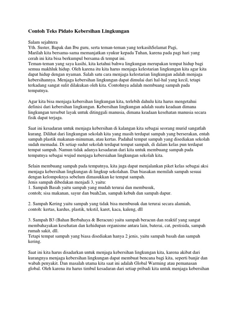 Yang terhomat Bapak Kepala SMA Negeri 3 Semarang yang saya hormati Bapak Ibu Guru. Web Mengenal Pidato Persuasif dalam Contoh Pidato Singkat tentang Kebersihan N domestik semangat bermasyarakat ataupun sekolah lektur sendiri kerap. Web Kebersihan merupakan sebagian dari iman jadi kita harus selalu menjaga kebersihan di lingkungan sekitar kita.