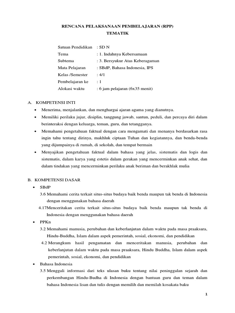 Rpp kurikulum 2013 sd kelas 4 (iv) semester 1 tema 1 indahnya keber…