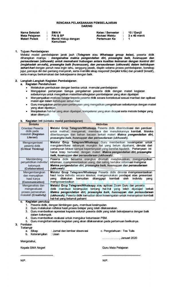 RPP Daring PAI Kelas 6 Tahun 2020 1 Lembar Halaman | Arsip Pembelajaran
