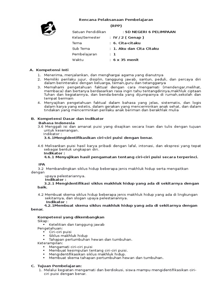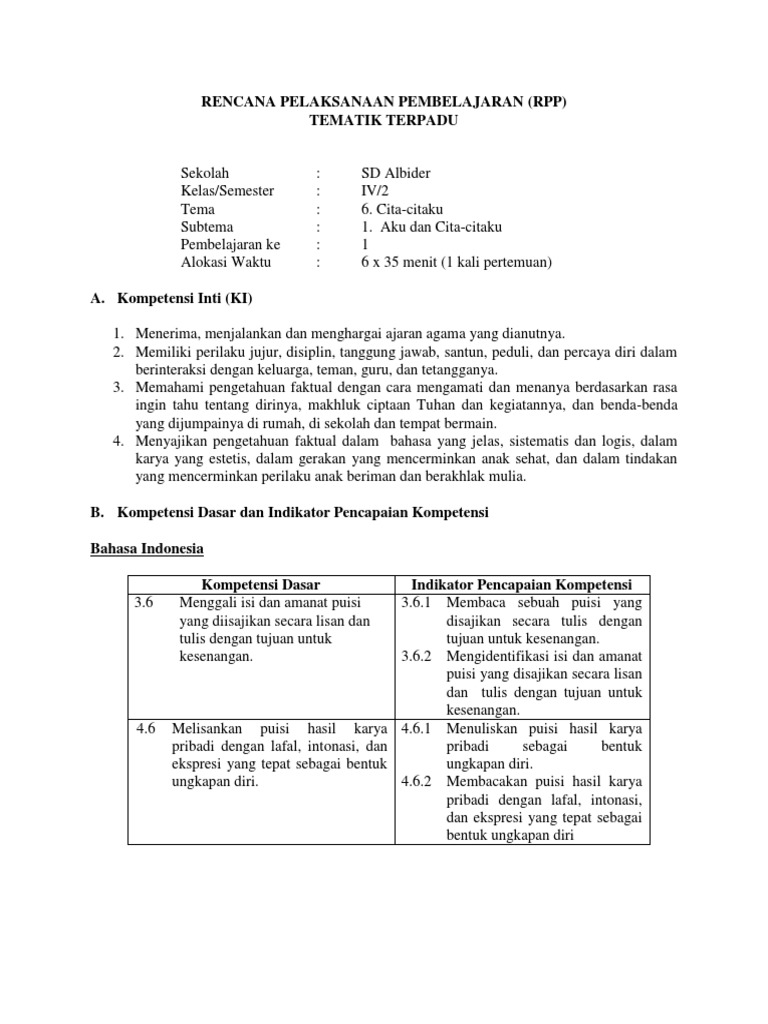 Rpp Tematik Kelas 4 Tema 6 Cita Citaku