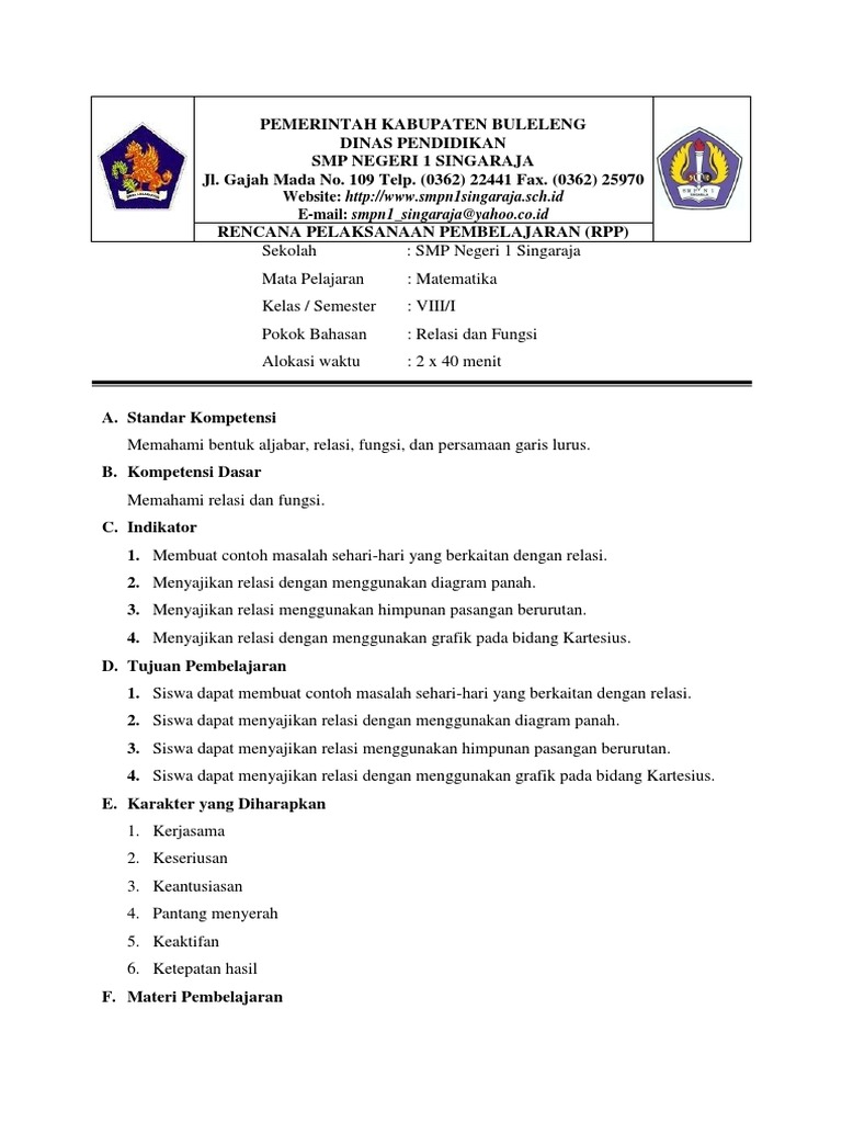 Pada malam ini Kami akan membagikan RPP yang bermata peljrn Matematika dikhususkan. Relasi dan Fungsi Tujuan Materi Pembelajaran. Web RPP SMP May 16 2018 1017.