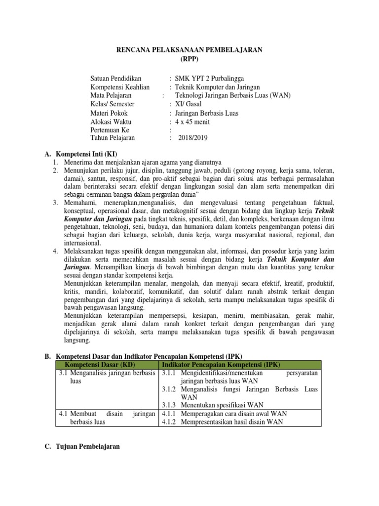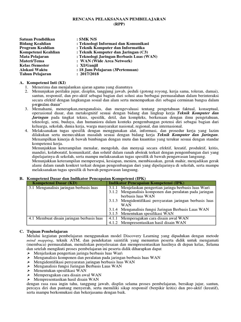 Rpp Teknologi Jaringan Berbasis Luas Wan Kurikulum 2013 Revisi 2018
