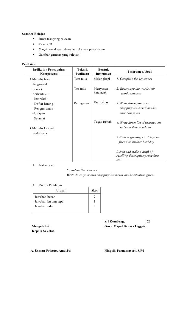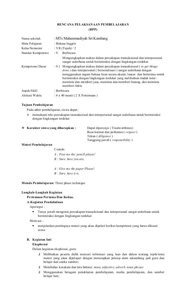 Pada RPP tersebut terdapat empat aspek. Web Nah berikut ini kami berikan tambahan koleksi RPP bahasa Inggris kelas 7 semester 1. Web Satu lagi kami hadirkan contoh Rencana Pelaksanaan Pembelajaran RPP bahasa Inggris khusus untuk sahabat KBI semua.