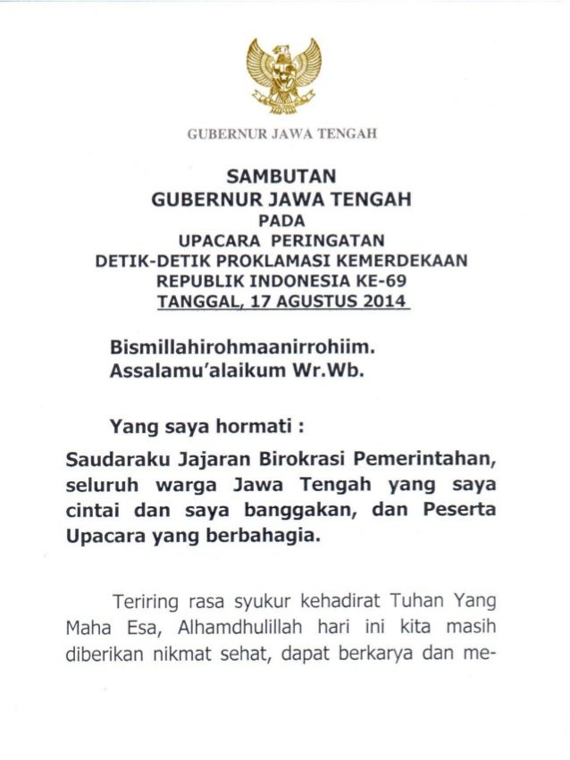 Web Naskah Sambutan Gubernur Jawa Tengah pada HUT RI 72 8 1 Download 0. Melalui akun instagramnya khofifahip Gubernur Jatim Khofifah Indar Parawansa mengundang masyarakat umum untuk mengikuti upacara bendera di.