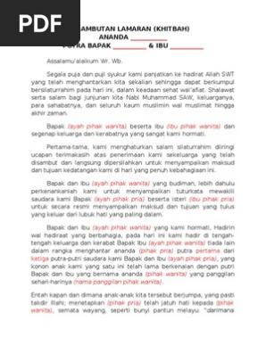 Sambutan Pihak Pria Acara KhitbahLamaran Assalaamualaikum warahmatullaahi wabarakaatuh Lanjut untuk baca di tab baru. Ha Es Ye Lamaran Pihak Laki Laki. Contoh sambutan panampi penerimaan pengantin pria dalam bahasa jawa.