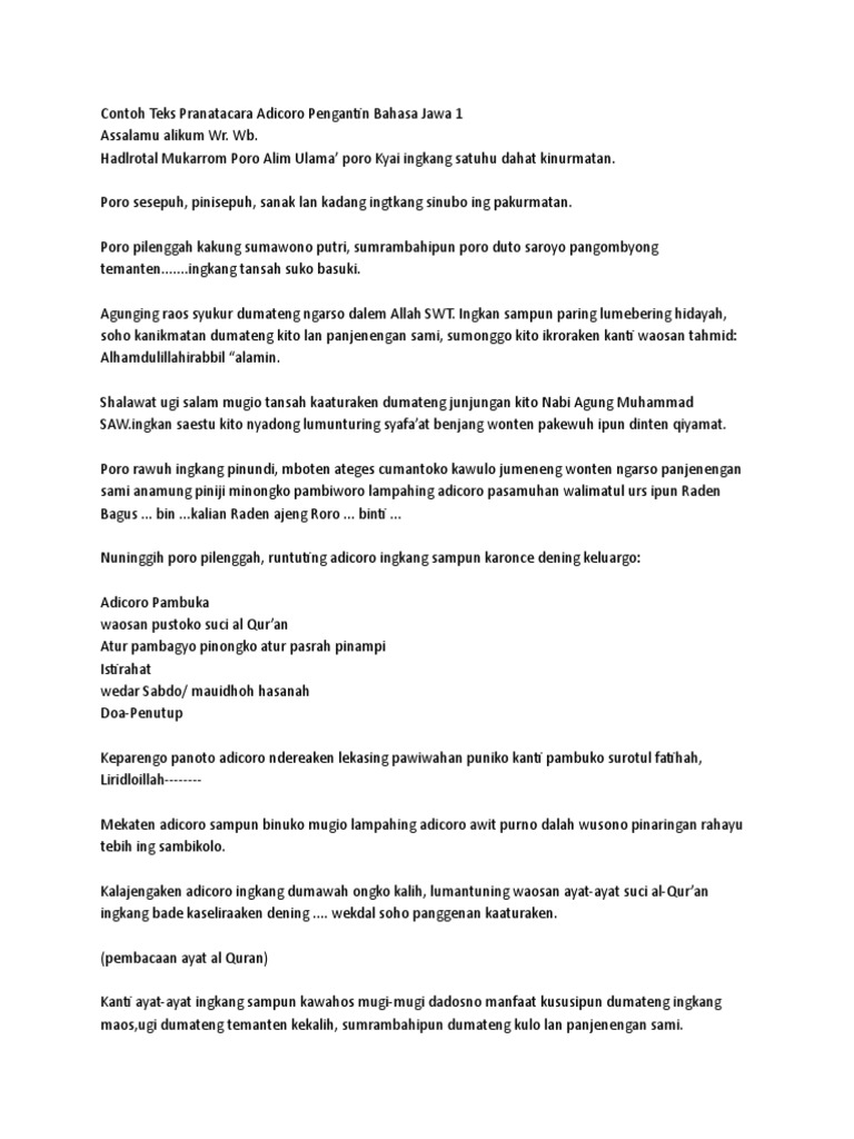 Contoh saja ada tugas sekolah untuk membuat Pidato dengan bahasa. Hukum wudhu di kolam kotak sahkah wudhu jika mc bahasa jawa assalamualaikum muqaddimah sepindah. Langsung saja berikut adalah Contoh Teks Panyandra Temanten Jawa yang akan diawali dengan.